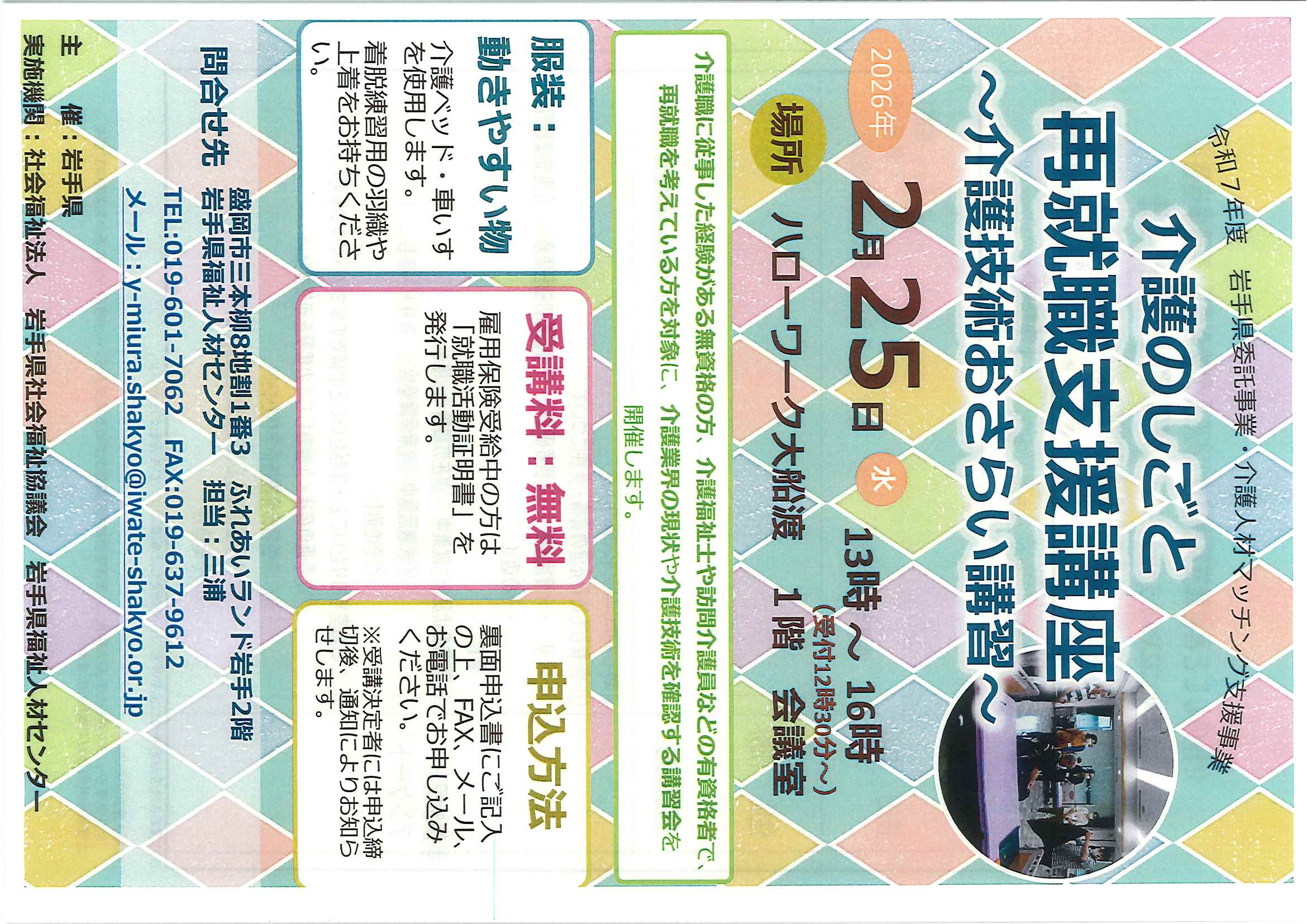 介護のしごと 再就職支援講座~介護技術おさらい講習~ 介護職に従事した経験がある無資格の方、介護福祉士や訪問介護員などの有資格者で、再就職を考えている方を対象に、介護業界の現状や介護技術を確認する講習会 ※服装は動きやすいもの、また羽織や上着をお持ちください。