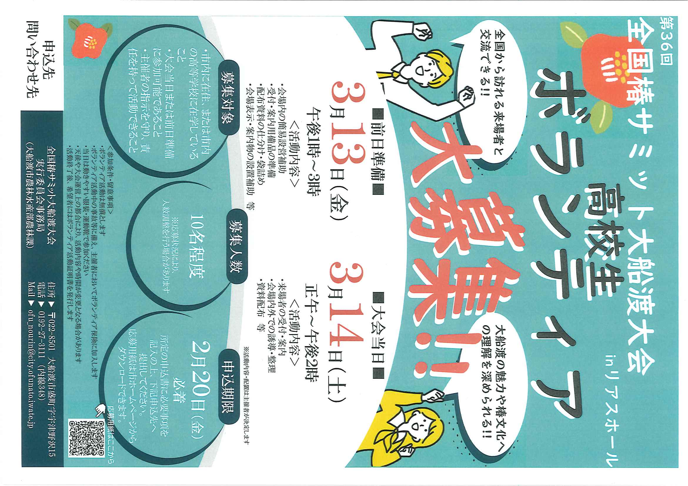 第36回全国椿サミット大船渡大会 高校生ボランティア大募集 「全国椿サミット」は、全国の椿愛好家や椿を市町村の花木に指定している自治体関係者などが一堂に会し、椿に関する研究発表や情報交換、地元住民との交流を図ることなどを目的として開催している大会です。 当日または前日にお手伝いできる高校生ボランテ...