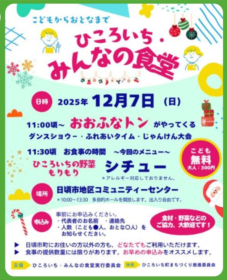 ひころいち・みんなの食堂 11時頃) ・おおふなトンがやってくる…ダンスショウ・ふれあいタイム・じゃんけん大会 11時30分頃~13時頃)食事 ・ひころいちの野菜もりもり「シチュー」 ※多目的ホールは、10時~13時30分まで開放、出入り自由。